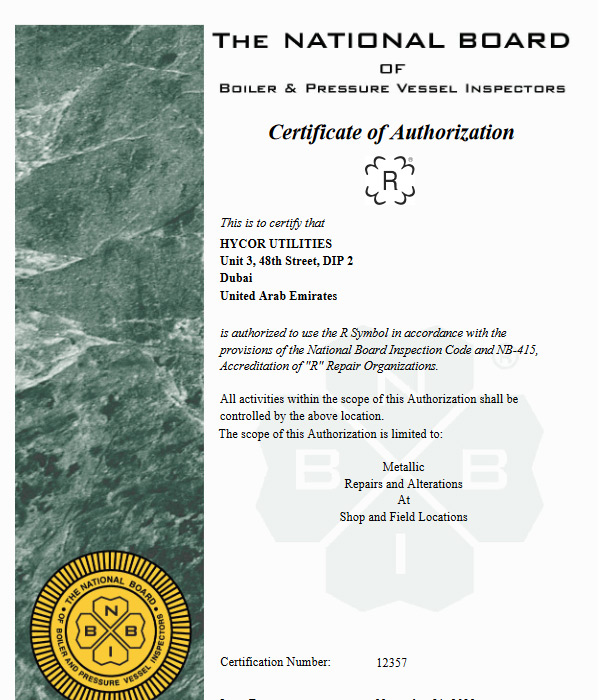 HYCOR is ASME Certificated Fabrication facility for ‘U’ Stamp with accreditation from the National Body for Pressure Vessels and Inspection for ‘R’ Stamp,